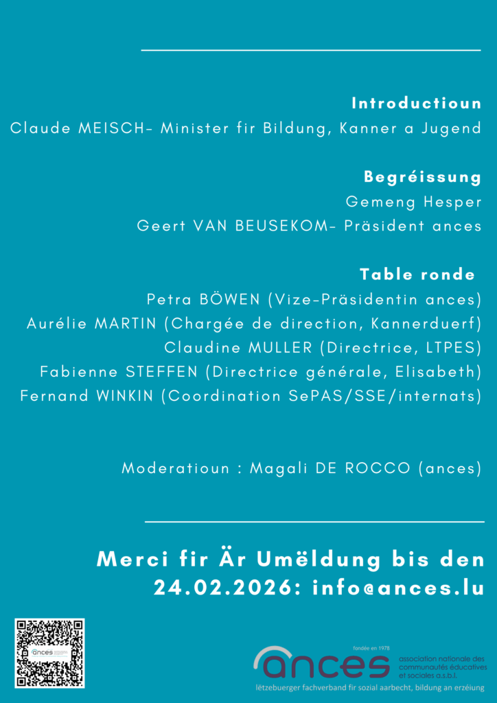 Als Fachverband mit mehr als einer 45-jährigen Expertise, möchten wir im Rahmen der “Table Ronde” einen Blick auf 50 Jahre Ausbildung zum „Educateur“, deren Entwicklung im Laufe der Jahre nachzeichnen und die Herausforderungen für die Zukunft diskutieren.
